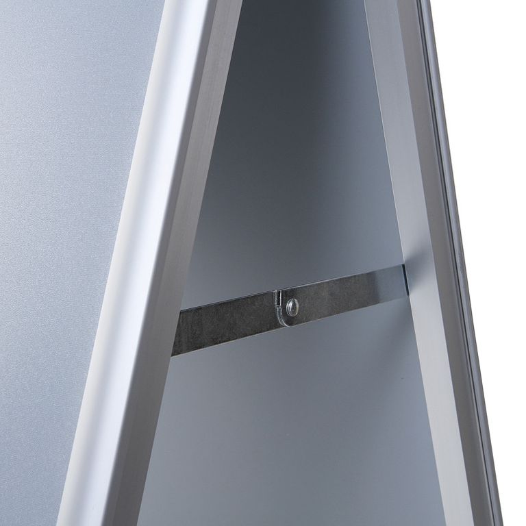 - die Federn zum Öffnen und Schließen der klappbaren Rahmenelemente sind aus hochwertigem Federstahl, nicht aus günstigerem Blech. So bleibt der Plakatständer auch bei häufigem Plakatwechsel funktionstüchtig und schließt an den Seiten bündig mit den Folien zum besseren Schutz Ihrer Plakate.